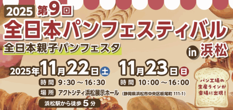 2025年11月22日(土)・23日(日)に、静岡県浜松市のアクトシティ浜松展示ホールで開催される「第9回 全日本パンフェスティバル in 浜松(全日本親子パンフェスタ)」 に、堤製パンのパンが登場します。 全国の人気ベ […]